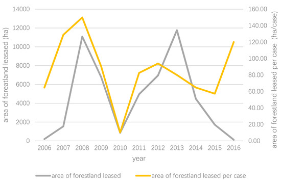 Forestland lease market emerged along with increasing transfer of usage rights of forestland from collective to individual farm households in Ningdu. This provided us with ample local-based evidence to form a sound understanding of development for the ongoing forestland market. The Ningdu Forestry Administration Bureau set up an agency providing services as policy consultation, forestland demand or supply information distribution, auction, bidding, and assistance of the contract signing. This universal practice facilitated development of the lease forestland market throughout Jiangxi Province [11]. The agency started to collect data of forestland leasing based on the transfers of contracts signed in-house from 2006. The data presents leased forestland with an area per case larger than 10 hectares (Figure 1). The data provided the general dynamics of the lease forestland market from 2006 to 2016—note that inadequate information of single cases of leased forestland with a scale of smaller than 10 hectares was not available.