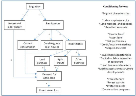 The most direct forest impact is when remittances or savings are used to convert forests to agriculture or to buy agricultural land, increasing overall land demand. This is more likely to happen when farmers are linked to regional, national or even international markets, and when family or hired labor is available at low costs [40]. If agricultural production is capital- (rather than labor-) intensive, as in cattle raising, remittances can help capital-constrained farmers buy more cattle and expand their operations at the expense of forests [14,17,23].