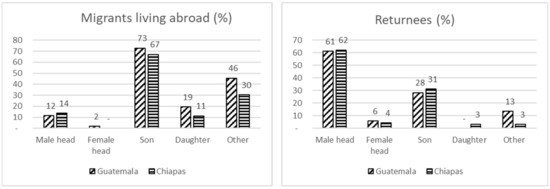 Migration from both countries is strongly male-dominated. As shown in Figure 3, among households with a migrant currently living abroad, male adult children make up 73% (Guatemala) and 67% (Chiapas) of migrants. Only 19% and 11 %, respectively, have an adult female child abroad. Among households with returnees, in more than 60% of cases in both countries, the male household head is the return migrant. This gendered pattern of migration can be explained by the expectations placed on young men to accumulate capital before establishing their own family, and migration is an attractive option for achieving that. Field interviews with returnees also suggested that employment was more available for males than for females. Finally, it was considered less safe for young women to migrate.