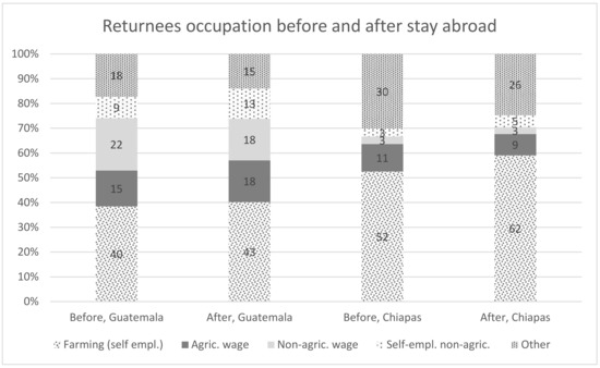 A complementary way of investigating the impact of migration on livelihood strategies is by comparing returnees’ occupation before and after their stay abroad. Most returnees were engaged in farming activities before migrating: 40% in Guatemala and 52% in Chiapas (Figure 4), and that share increased upon migrants’ return in both countries. An increase in self-employed farmers in Chiapas of about 10 percentage points (pp) was accompanied by a decline of 2 pp in agricultural wage-employment and 5 pp in other activities, indicating that after return, migrants were able to buy or rent land to cultivate (see below). In Guatemala, we observed a 3 pp higher involvement in farming after returning to the community and also more agricultural wages. These figures fit the picture depicted by Table 3 (Note the differences in the shares, as the Table 3 figures are at the household level while Figure 4 refers to individuals, and several returnee households have more than one returnee.) In conclusion, migration does not imply a farewell to agriculture; returnees tended to be more involved in agriculture than before they migrated, and households with a migrant abroad are more reliant on agriculture than non-migrant households.