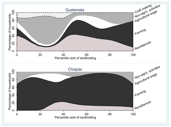 Figure 5 depicts the link between economic activities and landholdings, revealing an agriculture-dependent local economy in Chiapas and more diverse local economy in Guatemala. In Guatemala, farming as the main occupation was closely associated with large landholdings, whereas non-agriculture activities dominated in households below the 40th percentile for landholdings. In Chiapas, farming was the dominant income source across all land categories. The contrasting patterns observed suggest more non-farm income opportunities for land-poor farmers in the Guatemalan communities.