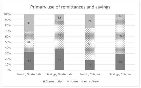 Migration from Guatemala is more mature than from Chiapas, and its impact on land use and land cover may follow a specific pattern over time. Our findings are largely consistent with the Massey et al.’s [43] hypothesis about how remittances and returnee savings use changes over time from current consumption to house building/improvement to productive investments (e.g., agricultural land). The share spent on building a house was significantly higher in Chiapas than in Guatemalan communities, while the opposite is true for agricultural investments (Figure 7). Massey et al. [43] concluded that home ownership “was a universal aspiration among families (in their study sites) and that migration is employed as a means to achieve this end.” (p. 219). Our informants confirmed that house-building was a high priority and that they preferred to build a house before investing in production. Moreover, there are no public programs supporting house acquisition by poorer families in either Mexico or Guatemala, and our fieldwork revealed that access to credit for this purpose is limited.