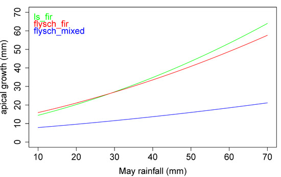 (adjusted R2 = 0.98), indicating a linearly declining effect of site on growth between ls_fir and flysch_fir with increasing May rainfall. At high rainfall values, the curve crosses the y = 0 threshold, marking that high soil clay limestone sites become more favourable for growth than low clay flysch ones. The logarithmic transformation of age shows that the declining difference (and the associated quicker threshold crossing) due to increasing age is gradually levelling off. However, the difference in the goodness of fit with the regression model estimated with the untransformed values is not great and while the general idea of declining difference with increasing age can be trusted, the exact form of the decline is only indicative.