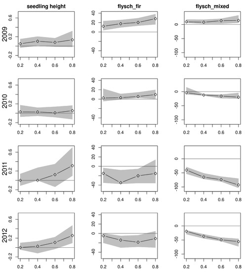 A more complete picture arises by looking at the graphs of the coefficients estimated for a more full range of quantiles (Figure 3). While the slope values for initial height are generally close to zero, they depart therefrom in the last two years but only for the higher quantiles. Both the positive and negative effects of site type flysch_mixed are stronger in higher quantiles and this pattern is stronger in the last two years as well. The effect of site type flysch_fir exhibits the most complicated pattern. While the positive effect increases in higher quantiles in year 1 and 2, it shows signs of being non-monotonous thereafter, with the intermediate quantiles being negatively affected and the low and the high ones being closer to zero.