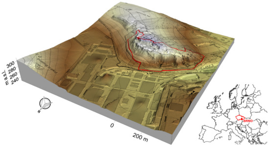 The elevation of Stránská skála (Figure 1) is situated in Brno city, in the southeastern part of the Czech Republic (South Moravian Region). It covers an area of approximately 16 ha with its highest point at 310 m a.s.l. Since 1978, the site has been protected (today, according to Act 114/1992 Coll. [70], as a National Natural Monument).