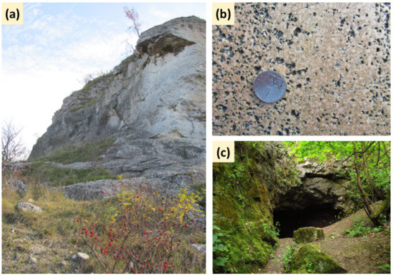 Figure 2. Stránská skála in Brno, Czech Republic: (a) Upper Jurassic limestones displayed in an old quarry; (b) A detail of Crinoidea limestone with debris of Jurassic (Oxfordian) fossils; (c) Underground spaces: most of the caves are modified by human activity. Sources: personal collection.