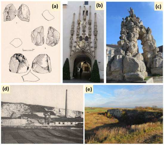 Figure 3. Geo-cultural issues of Stránská skála: (a) Stone artifacts from the Cromerian age—the testimony of Neolithic settlements; (b) Example of the use of the Crinoidea limestone—portal of the Old Town Hall; (c) Use of limestone on Parnas Fountain at Zelný Trh Market; (d) Stránská skála at the beginning of 20th Century when individual quarries were still in operation; (e) A mosaic of rock outcrops, grasslands and bushes contributes to the aesthetical qualities of the site. Sources: (b,c,e)—personal collection; (a,d)—Musil ed. [81].