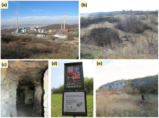 Figure 4. Examples of cultural ecosystem services provided by geodiversity at Stránská skála: (a) Abandoned valley of Svitava River between Stránská skála and Bílá hora Hill is important for palaeogeographical studies; (b) Sinkholes on the plateau allow us to study karst features and the impact of old mining on the landscape; (c) Anthropogenic underground has strong links to the industrial history of the city and it is also a resource for the modern urban legends; (d) Stránská skála is a part of the geoheritage of Southern Moravia, protected as a National Natural Monument; (e) The site is popular for local people and visitors. Source: personal collection.