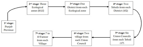 Considering the climatic variability and cropping patterns, three regional agro-ecological zones were selected randomly in the second stage. At the third stage, we selected one district from each zone. Then, at the fourth stage, two cities (tehsils) were chosen randomly from each of the districts. In the next stage, six union councils were selected from each of the tehsils for the research purpose here. According to the administrative set-up of the Punjab province, each union council consists of multiple villages. Consequently, in the sixth stage, three to four villages were selected from each union council, and, at the seventh stage, nine to ten farmers were chosen randomly from the chosen villages. As mentioned in Table 1, a combined number of 612 farmers were selected, with equal distribution of 204 farmers for each district (Note: initially, 222 farmers were allocated to each district but during survey, due to incomplete responses at the initial stage, the sample size was restricted to 204 farmers).