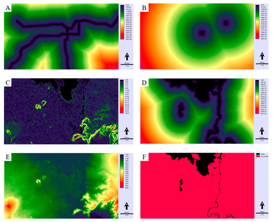Factors and constraint layer of urban expansion. (A,B,D) show the distance to the major road network, CBD, and waterbodies respectively (where distances increase from black to red), using Euclidean distance. (C,E) show slope (where slope increase from black to red) and elevation (altitude increases from black to red), respectively. (F) shows water bodies as a constraint layer (black represents water body; red, non-waterbody).