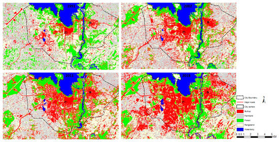 We used a range of datasets to analyze LUCs in Bahir Dar (Table 1). As the United States Geological Survey (USGS) Landsat images are frequently updated and publicly available through Earth Explorer (http://earthexplorer.usgs.gov/) [24], in this study, we used the overtime Landsat images on a 30-m resolution for 1991, 2002, 2011, and 2018. These images have cloudiness of less than 10% and were acquired in the winter season in which the area experiences little cloud cover, and there are fewer atmospheric errors. We also gathered a digital elevation model (DEM) of 30 m resolution from the Advanced Spaceborne Thermal Emission and Reflection Radiometer (ASTER). This was, in turn, used to prepare a slope layer for the area. Finally, vector data for the major roads in the study area were collected from OpenStreetMap, and its geometric consistency was verified in QGIS software.