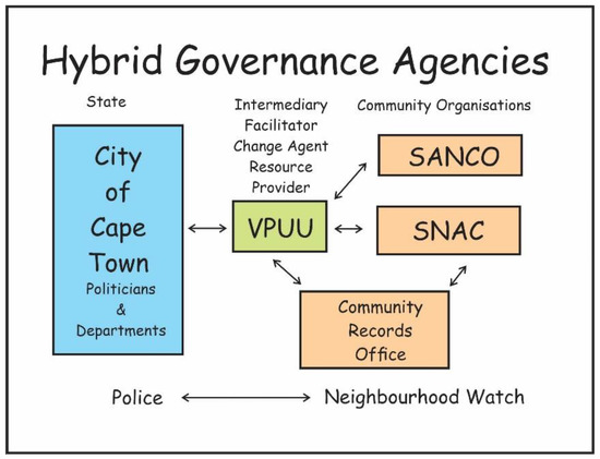 At the time of the research, the population of Monwabisi Park comprised 6900 households. The settlement is situated on 64 hectares of land comprising four parcels owned by the CoCT and the Western Cape provincial government. The Monwabisi shacks represent an estimated 5% of the informal dwellings in Cape Town [1]. As portrayed in Figure 1 above, the main role players in the hybrid land governance arrangements are two CBOs, SANCO and SNAC, the CoCT and VPUU. VPUU acts as an intermediary between the CBOs and the CoCT and provides expert support for the development planning, community-level land governance and the CRS. There are a number of other hybrid governance actors such as the South African Police Service and the Neighbourhood Watch that do not play a direct role in land tenure administration, but contribute to safety and stability.