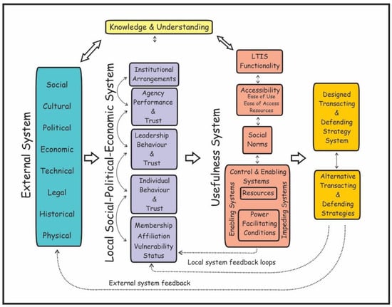 Portrayed in Figure 2, the whole system comprises four main sub-systems: (1) the Designed Transacting and Defending Strategy System which residents are supposed to use to transact in land interests and to defend their occupation; (2) the Usefulness System; (3) the Local Social-Political-Economic System and (4) the External System. The various sub-systems in the Usefulness System have been adapted to land records systems from TAM going back to research projects in the 1990s [2,3]. The sub-systems in the Local Social-Political-Economic System are informed by research and consulting projects in informal settlements, land restitution cases, post-conflict situations, registration usage case studies in housing projects where the land had been registered in ownership and peri-urban customary land conflict areas.