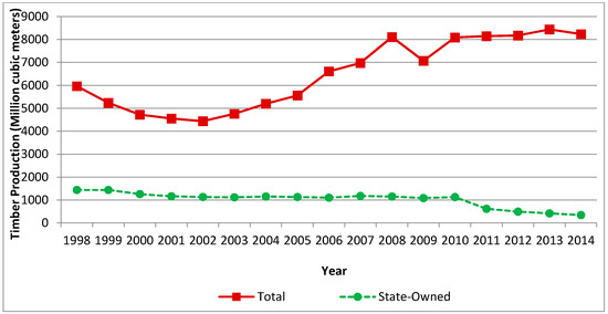 China’s total domestic timber production and the contribution of state-owned forestland. Notes: (1) Data sources: China Forestry Statistical Yearbook, 1998–2014; state-owned forestland timber production data are drawn from data on 135 key state-owned timber harvesting firms and 20 key state-owned forestland management bureaus. (2) Given the impact of the freezing rain and snow disaster and earthquakes, timber production in 2008 increased dramatically and returned to normal levels in 2009 [27].