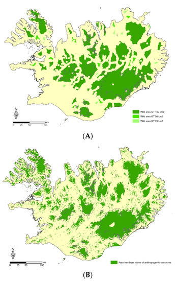 Iceland lacks a strong tradition for wilderness mapping and limited research exists on the subject. The first attempt at mapping Icelandic wilderness was carried out by the Environment Agency of Iceland following the passing of Act on Nature Conservation No. 44/1999 [25], where the definition of wilderness was first presented in Icelandic law. This mapping was updated in 2009 and based on available digital geodata, which was limited at that time, especially as regards spatial distribution of power lines. The next attempt was conducted by Ólafsdóttir and Runnström [10] who based their mapping on internationally recognized methods. Their mapping took thus into account remoteness from motorized access, permanent settlements, and signs of technological infrastructure, such as power lines, power plants and reservoirs. Digital geodata from the IS50v National Land Survey of Iceland database was gathered, as well as from other institutes, while the coordinates for analog data were digitized. The data was further categorized according to traffic density, size of settlements and the type of technological traces and the distances (from 0.5–5 km) for each category were calculated. They tested two types of mathematical models, i.e., distance analysis, which is based on the mapping of areas that are at a certain distance from an infrastructure (Figure 1A), and viewshed analysis, which is based on the mapping of areas free from visual impact of infrastructure (Figure 1B). Their results indicate that wilderness covers around 30% of Iceland’s total area, and thereof a third is covered by glaciers.
