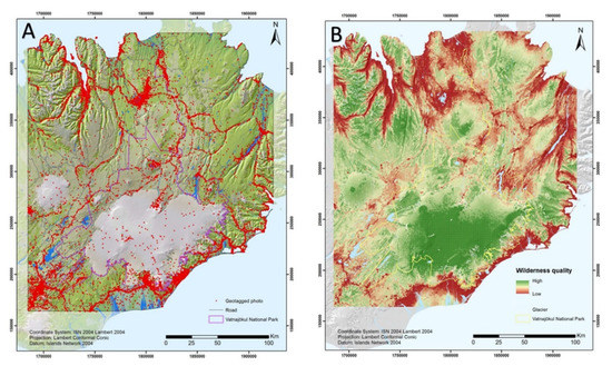 (A) The distribution of web-shared geotagged photographs taken by tourists in the eastern part of Iceland. (B) Wilderness map over the same area. Vatnajökull National Park is delineated by a yellow line [27].