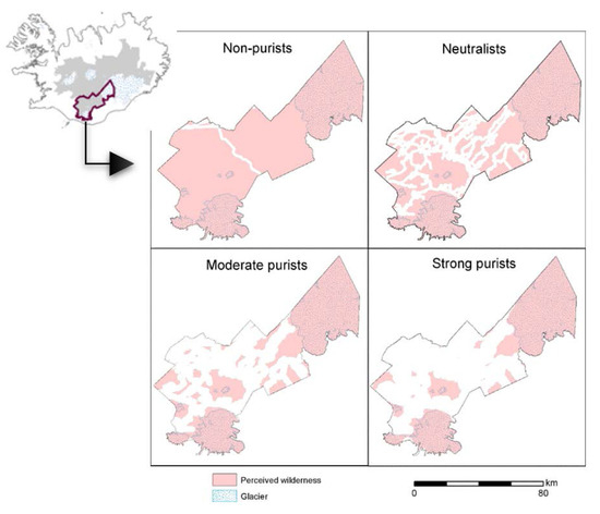 One of the reasons why it has been difficult to agree on a definition of the wilderness concept is that the boundary between man-made and natural environment is often unclear and perceived differently between individuals [19,20,21,22]. Accordingly, as an alternative approach, it has become more common to take people’s perception into consideration when mapping wilderness [23,24,25,26,27,28]. The first attempt to map wilderness based on perception in Iceland was a mapping of tourists’ experience of wilderness in the Icelandic southern highlands [17]. This mapping is based on the premise of the purism scale, which divides tourists into four groups according to their different perception towards the environment [29]. On one end of the scale are strong purists, who seek experiencing nature in its most natural state and want next to no service. Following them are moderate purists who also wish to experience nature, although they care less about it being in its most natural state. Next there are neutralists, who require rather good infrastructure and services, and are not highly sensitive when it comes to disturbances to the environment. Then, on the other end of the scale are non-purists, or urbanists, who want good infrastructure, high service levels, and are not sensitive to disturbances to the environment, or the number of other tourists. The results indicate that urbanists experience, more or less, the entire southern highlands as wilderness, while for purists less than half of the area is wilderness (Figure 4). Numerous studies have been conducted worldwide to evaluate the experience of tourists towards wilderness and their reasons for visiting such areas (e.g., [12,30,31,32,33,34]). Individuals’ experience and perception of wilderness is dependent on many factors, such as their cultural and social background [35]. Furthermore, how people assess the value of wilderness is dependent on location, as well as the circumstances of each period. Nevertheless, many studies show that the most common reason behind the decision to visit a wilderness area is to be away from the crowds and city life’s hustle and bustle, and to experience simplicity and unspoiled nature (e.g., [3,4]).
