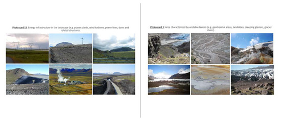 In the second part of the survey, the focus was on Icelanders’ perception towards wilderness. An attempt was made to calculate a wilderness value, which was based on respondents’ evaluation of different photographic supported scenarios. A Scottish survey from 2012, concerning the perception of the Scottish public towards wilderness, was used as a foundation for this part of the survey [41]. The aim of the Scottish survey was, on the one hand, to increase knowledge of the public’s perception of Scottish wilderness, and, on the other hand, to utilize that knowledge as a variable into further mapping of the Scottish wilderness. Their survey was based on the following four key attributes: i) the naturalness of the land cover and wildlife; ii) the presence of man-made structures and features; iii) the remoteness from roads; iv) the terrain. These attributes are similar to the ones that have been used to map wilderness and assessing wilderness quality in many countries [16,17,42]. To assess the public’s view of these attributes, the Scots created 25 scenarios, each of which is made up of several statements referring to the above four key attributes. Each statement was accompanied by a photo card containing several photographs to demonstrate the statement [41]. Numerous scholars (e.g., [43,44]) stress the benefits of using photo-elicitation to gain access to respondents’ perceptions and values and placing them in a position of self-awareness. Hence, in this part of the survey the perception of the survey respondents was evaluated with respect to the aforementioned four key attributes to calculate a wilderness score for Iceland using best-worst scaling technique. A total of 26 scenario statements were used based on the model of the Scots, but adapted to Icelandic conditions and the aims of this study. Each statement was thus adjusted to Icelandic circumstances and presented with a photo card with a few photographs (Figure 7). Due to the large number of photographs, each respondent received five scenario questions, (photo card with statement) which were randomly distributed between them. They were then asked to choose the statements they thought most and least compatible with their experience of wilderness. Based on this it was calculated which statement was considered the most or least descriptive of the respondents’ perception of wilderness. Wilderness scores were then calculated, showing which statements the respondents generally perceived as the most and least descriptive of wilderness. The wilderness score was calculated so that in the first scenario question, the respondent sees all five descriptions A, B, C, D and E. If he selects A as the description that best describes his perception of wilderness and C as the one that describes it the worst, description A is given a value 2 but description C is given a value −2. Three descriptions then remain to be decided upon by the participant. The next question therefore contains these three descriptions, B, D, and E. If the respondent selects B as the description that best describes his perception of wilderness, and E as the one that describes his perception the worst, description B will get the value of 1, but description E the value −1. Thus, information about the ranking of items is obtained for each survey respondent. The calculated wilderness scores provided a criterion for assessing the respondents perceived value of wilderness.