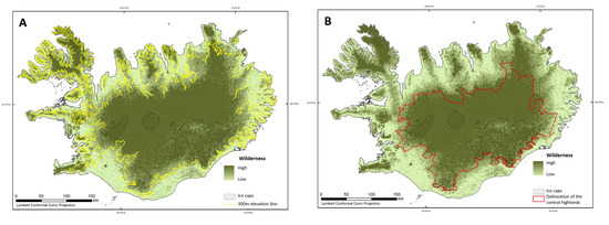 Wilderness mapping from Ólafsdóttir and Runnström based on the definition of Icelandic wilderness according to Act no. 44/1999 on nature conservation. (A) shows calculation based on a distance analysis and (B) calculation based on a viewshed analysis [10,15].