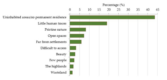 The results from the photographic scenarios reveal that uniform landscape, with few distinct landmarks, augments the perception of wilderness the most, i.e., the more open and homogenous the landscape, the stronger the sense of wilderness experience. Furthermore, landscapes without anthropogenic features enhance the respondents’ perception of wilderness, and this applies to all types of landscape. The anthropogenic features which decrease the respondents’ perception of wilderness the most are inhabited areas (towns and villages), energy constructions, and long linear forms, such as power lines, roads and tracks. Signs of tourism, such as walking paths and mountains huts have less impact on the experience of wilderness (Figure 10; Table 1). Meanwhile, wildlife (such as birds, foxes, seals) increases the experience of wilderness, while domestic animals reduce the experience.