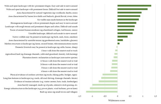 Attributes with positive (dark green) and negative (light green) wilderness scores. The higher the score, the stronger is the perceived wilderness perception. Likewise, the lower the score, the poorer is the perceived wilderness perception.