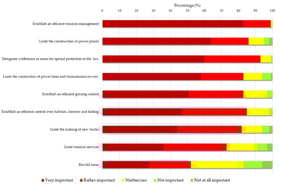 To analyze the importance of wilderness in the mind of the Icelandic public and what types of infrastructure are considered appropriate to match that importance, the survey respondents were first asked how important they consider wilderness as a part of Icelandic nature. A vast majority of respondents (94%) regard wilderness as very important (66%) or important (28%). Approximately 70% think that the Icelandic wilderness is at risk, while 30% believe this is not the case. Those who consider wilderness to be at risk were also asked about the actions they consider important in order to reduce the risk. The majority consider it important to bring about efficient tourism management (83%), limit the development of power plants (63%), designate wilderness as a specific conservation area in regulations (60%), and limit the construction of power lines and radio masts (58%). Other attributes weigh less (Figure 12). Principal component analysis identified two components which together explain 56.1% of the total variance in the answers (Table 2). The first factor seems to be measuring restricting actions towards anthropogenic transformation. Respondents scoring high on this component in general think it to be important to limit the construction of power plants, power lines, and transmission towers, limit tourism services and the making of new tracks as well as re-wilding areas by for example removing anthropogenic structures, reducing the number of roads and tracks, eliminating alien species, reducing grazing and restoring natural vegetation. This first factor explains about 42% of the total variance of the variables. The second component consisted of respondents who prefer more efficient management actions based on research and planning, such as designation of wilderness as areas for special protection in Icelandic law, and the establishment of efficient management as regards grazing, tourism, forestry, and fishing.