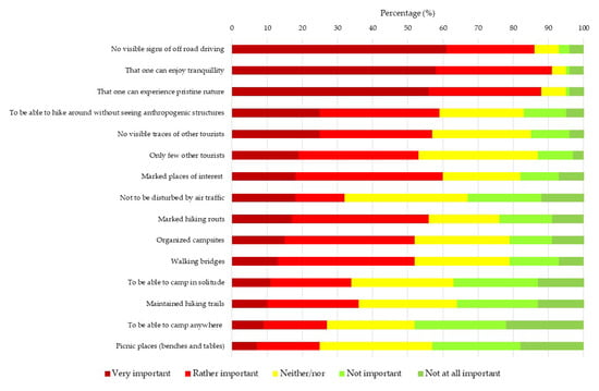 To obtain a figure of the Icelandic public with respect to the purism scale that hitherto has mainly been used to categorize tourists, the survey respondents were asked about the importance of several elements when they travel in Icelandic wilderness. This specific question has been used in multiple studies in Iceland to categorize types of tourists according to the aforementioned purist scale [12,34]. The results demonstrate that the respondents find most important to not see traces of off-road driving, to enjoy tranquility, and experience pristine nature. They, moreover, regard being able to walk in nature without seeing anthropogenic infrastructure or signs of tourism to be important. Markings at places of interests, marked walking routes, pedestrian bridges, and campsites with facilities are elements that weigh less for Icelanders (Figure 13). Hence, the respondents place a considerable emphasis on the pristine appearance of nature in wilderness and to be able to experience tranquility and quietude, while they find infrastructure, such as rest areas and designed footpaths, less important. However, the responses underlying the pattern obtained from the principal component analysis identified three components which altogether explain 63.8% of the total variance in the answers, reflecting Icelanders’ tolerance towards anthropogenic infrastructures when it comes to outdoor recreation (Table 3). The first factor explains about 33% of the total variance of the variables. Respondents scoring high on this component are in general of the opinion that good infrastructure and services are important. They prefer constructed and maintained hiking trails, bridges over rivers, organized campsites and picnic places, marked hiking routs and marked places of interest. The second strongest factor represents a desire to experience pristine nature and it explains about 20% of the total variance. For respondents scoring high on this component, it is important to be able to enjoy nature in solitude and tranquility, relying on themselves in challenging situations, and to have no visible signs of off-road driving. The third factor reflects attitudes characterising those who appreciate freedom, such as being able to camp anywhere they want.