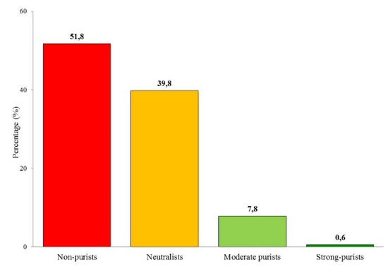 The results from the principal component analysis corresponds with the analysis of the survey respondents according to the purism scale, which shows that over half of them (52%) fall into the category of urbanists, less than 40% into the category of neutralists, under 8% of moderate purists, and less than 1% of strong purists (Figure 14). This is interesting as research into the composition of tourists in various nature destinations in Iceland [12,45,46] shows that neutral tourists are the most numerous category, or over half of all tourists, while urbanists count for a quarter, and purists for one-fifth of tourists.