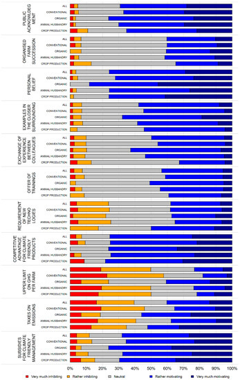 Farmers rated personal beliefs (75.6%) and public acknowledgment (68.9%) as very motivating for reducing GHG emissions, as well as training opportunities (43.3%) and an organized farm succession (40.2%). Examples in the vicinity (57.5%) and exchange of experiences with colleagues are somewhat to highly motivating for half of the farmers (49.6%). Almost a quarter (23.6%) of respondents would be discouraged if new technologies were required to reduce GHG emissions from agricultural activities. A competitive advantage for climate-friendly products would strongly motivate farmers to reduce emissions (75.2%). Subsidies for climate-friendly management were rated as motivating by 67.7% of the farmers. Farmers’ responses to taxes on emissions do not show a clear response. Almost half (49.6%) of the respondents would feel discouraged by an upper limit for GHG emissions on the farm (Figure 2).