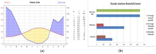 (a) Walter–Lieth diagram for Chania region illustrates the climatic variables of air temperature and precipitation, (b) The average annual, average monthly (January-February) and monthly rainfall amounts that recorded at Souda Weather Station [].