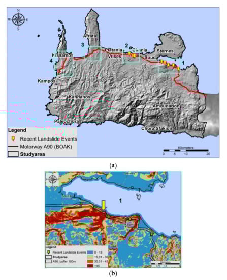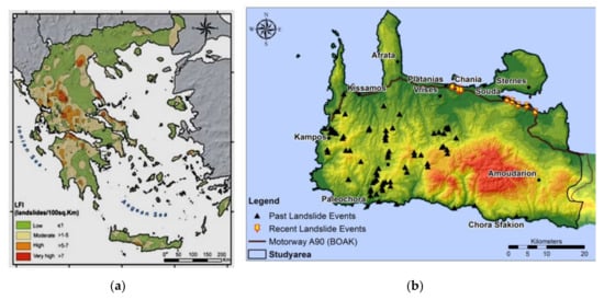 (a) The Landslide Frequency Index (LFI-landslides/100 km2) map of Greece [], (b) The past and recent (2018–2019) landslide events in Chania prefecture [].