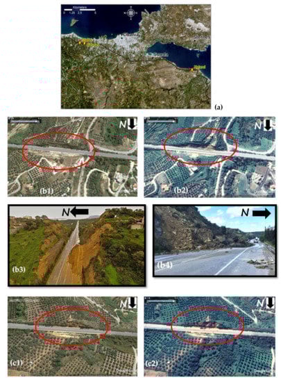 (a) The spatial distribution of three landslide events occurred recently along the motorway A90 due mainly to intense rainfalls, (b1–b2) Google Earth images showing the pre and post landslide event of Stalos area, (b3–b4) field survey photos of Stalos landslide event, (c1–c2) Google Earth images showing the pre and post landslide event of Galatas area, (c3–c4) field survey photos of Galatas landslide event, (d1–d2) Google Earth images showing the pre and post landslide event of Kalami area, (d3) field survey photos of Kalami landslide event.