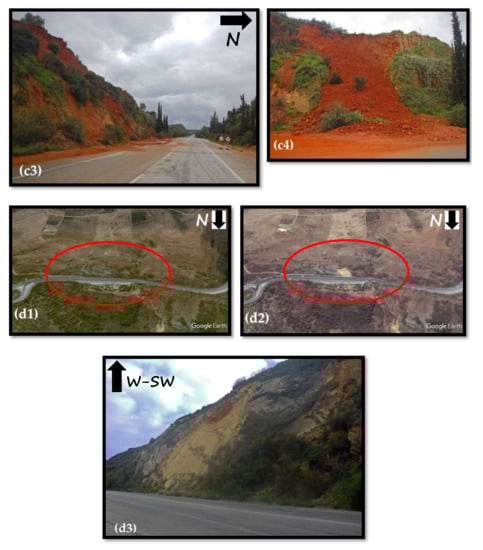 The intense and prolonged precipitations from the September 2018 to February 2019 period expanded the landslide phenomenon to areas in the north and north-east and particularly in areas of intense human activity that rarely have faced it in the past. All of the cases took place along the main highway (A90), which crosses the entire northern part of the island, from one end to the other, with an E-W direction of the prefecture, which constitutes high risk areas with intense human exposure and high vulnerability level (Figure 2b). More specifically, five (5) landslide events occurred in the west, close to Agia Marina (two sites), and in Stalos, Galatas and Katos Stalos (Malindreto) villages, and four at the east, close to Platani (three sites) and the Kalami area of the City of Chania [] (Figure 3b). Most of these recent landslide events that took place along the main highway A90 are caused, along with the intense rainfalls, from slope instability problems. Hasty road constructions (because of time and financial constraints) without proper geological and geotechnical examination may lead, under extreme rainfall conditions, to slope failures [].