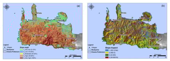 Topographic factors constitute the most significant geomorphological parameters that control slope stability []. From the VHR DEM, geomorphological thematic layers such as slope angle and aspect were calculated [,,].
