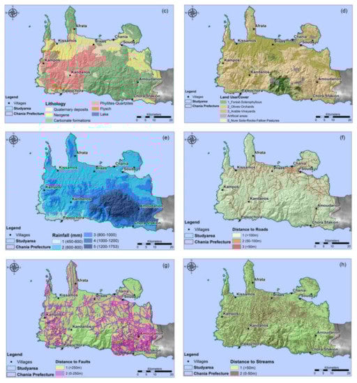 The thematic raster maps of the eight (8) factors, used for the estimation of Landslide Susceptibility of Chania Prefecture: (a) Slope angle, (b) Slope aspect, (c) Geology, (d) Land cover, (e) Mean annual precipitation distribution, (f) Distance to roads, (g) Distance to faults, (h) Distance to streams.