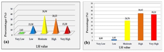 (a) The percentage of the five LSI classes in the area under study, (b) the percentage of the past landslides in correlation with the LSI map.