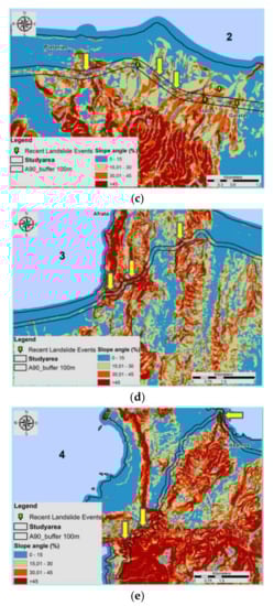 Slope angle and slope geometry are crucial issues for slope instability [,,]. The moisture content, the pore pressure and the hydraulic behavior of a slope could be dominated by slope angle patterns [,]. Therefore, slope angle estimation is an essential part of hazard assessment. Slope angle was obtained from DEM and reclassified into five classes (based on our expert knowledge of the study area and related literature) according to their response to LS (a) very gentle slopes (0–10%) as 1, (b) gentle slopes (10–20%) as 2, (c) moderate steep slopes (20–30%) as 3, (d) steep slopes (30–60%) as 4, and (e) very steep slopes (>60%) as 5 (Figure 6a).