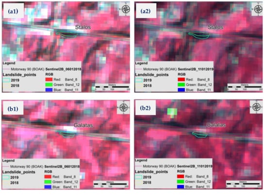 Several EO data sets, free of charge, were acquired for this study. Sentinel-2 constellation of two satellites (A and B) constitutes the flagship of the European Space Agency (ESA) Copernicus program, which provides advanced and continuous data through the free access hub. Three S2 atmospherically corrected (2A) images, from the same season of the year (pre- and post-landslide, January 2018 and January-March 2019) were acquired. Even though the spatial analysis of Sentinel-2 images is considerably coarser than sub-meter detailed optical data, such as the VHR satellite images of WorldView, QuickBird, and so on, it is characterized by a much shorter revisit time and cost-free access [,]. The images were resampled to 10m (preprocessing procedure using as reference product band 2) and several false color composites (e.g., using Bands 3, 4, 8, 8A, 11 and 12) were tested to distinguish the recent landslide scars. The Normalized Difference Vegetation Index (NDVI) was produced to assist the creation of the land cover map. NDVI denotes the variation among the visible red and the near infrared [], relating to vegetation characteristics. The index shows values in the range−1 to +1. In the absence of vegetation (e.g., bare soil, rock, and urban areas), NDVI represents low positive (0 to 0.2) or negative values (all the other land covers except vegetation). On the other hand, in the existence of vegetation (e.g., grassland, forests), the index obtains values from 0.2 to 1 [,]. An image difference technique used to detect shallow landslide displacements between the pre- and post-landslide images. For this reason, two images from the same season were selected (January 2018 and January 2019) to avoid differences of vegetation phenology [,].