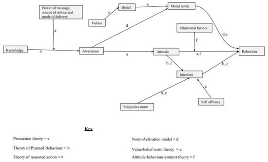 Integrated Framework of the behavioural theories to aid understanding of pro-environmental behaviour. Note: We use letters to represent the different pathways (e.g., knowledge-awareness link, awareness-behaviour link, knowledge-behaviour link) hypothesised in each of the theories.