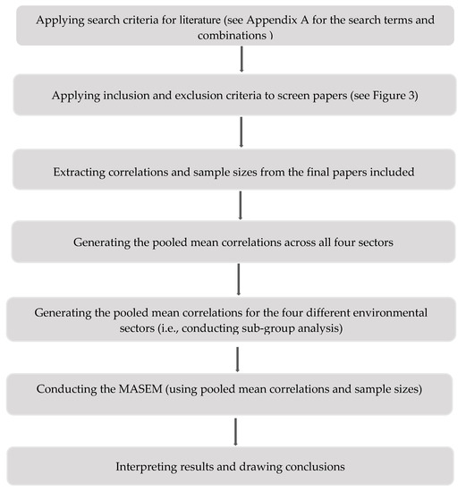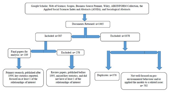 The aim of the present study is to assess the empirical evidence base of the determinants of pro-environmental behaviour predicted by the theories described in Section 2. For this purpose, we adopted a meta-analytic structural equation modelling (MASEM) technique. The first step involved an online search of the literature focussing on the determinants of pro-environmental behaviour (see Figure 2 for an overview of the research design used in this study). We restricted our search to papers written in English and published after 1994, when application of theories to understand pro-environmental behaviour gained considerable momentum [22]. Keywords such as pro-environmental behaviour, pro-ecological behaviour, etc. were applied in multiple search queries to retrieve data from Google Scholar and other academic databases such as Web of Science, Scopus, Business Source Premier, PROQUEST’s ABI/INFORM Collection, the Applied Social Sciences Index and Abstracts (ASSIA) and Sociological Abstracts (see Figure 3 for the document selection process and Appendix A for keyword groupings). After applying a follow-up snowball search and removing duplicates, we obtained 387 papers.