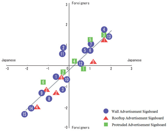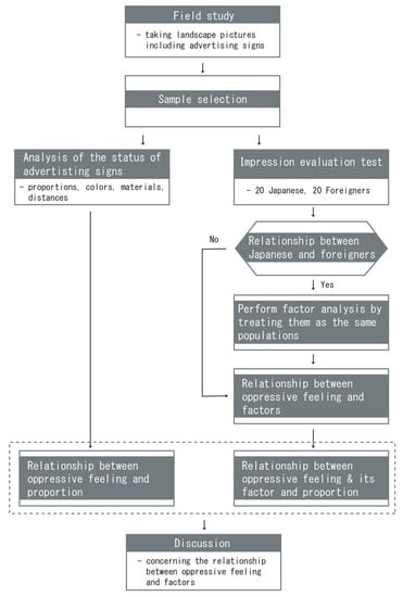54], which were subjected to a status analysis to perform the impression evaluation. The relationship between Japanese and foreign nationals was then checked; if there were any correlations, then the factor analysis would be performed by considering them to be identical populations, and it would be performed separately if there was no correlation. The relationship between the oppressive feeling and factors or oppressive feeling and the proportion (area ratio) of advertising signs was then calculated, followed by the final comprehensive considerations.