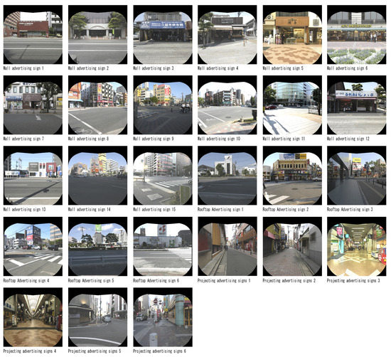 A tripod was used, and the level and vertical alignment were adjusted at a height of 130 cm. In the landscapes to be presented to the subjects, 15 images containing wall advertisements, 6 images containing rooftop advertisements, and 6 images containing projection signboards were selected (for a total of 27 images). The pictures were taken in such a way that the surrounding conditions could be recognized sufficiently, with a central focus on the road.