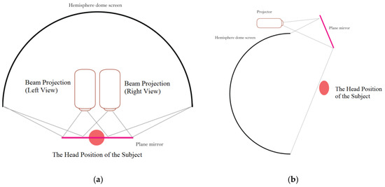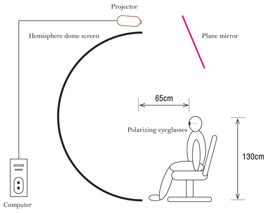 Figure 3 is as follows: the two beam projectors positioned at the top of the cyberdome project separate images, which are reflected in a plane mirror to create VR images in the dome, as seen by the subject wearing a pair of polarizing lens. In this case, one eye sees the image projected by one of the two projectors, whereas the other eye sees the image projected by the other projector. Furthermore, to avoid the subject’s head from interfering with the images, they keep a distance of 65 cm while maintaining their eye level at 130 cm from the ground. Picture (a) in