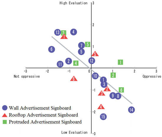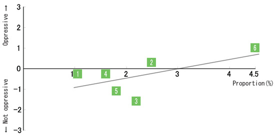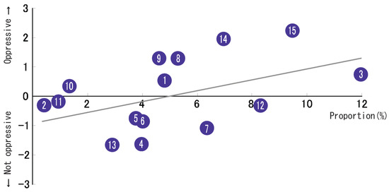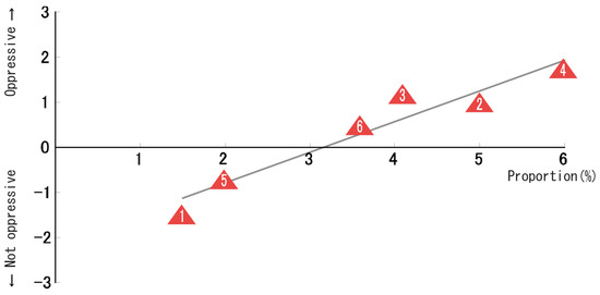 Figure 11 (projection advertising signs). Comprehensively, in a positive correlation, the oppressive feeling increased when the proportion increased or vice versa. There was a high correlation between oppressive feeling and proportion of rooftop advertising signs, as well as relatively strong correlations between oppressive feelings and wall or projection advertising signs. Thus, it is possible to conclude that the differences in impression evaluation results obtained from the sample pictures were closely related to the proportion of outdoor advertising signs.