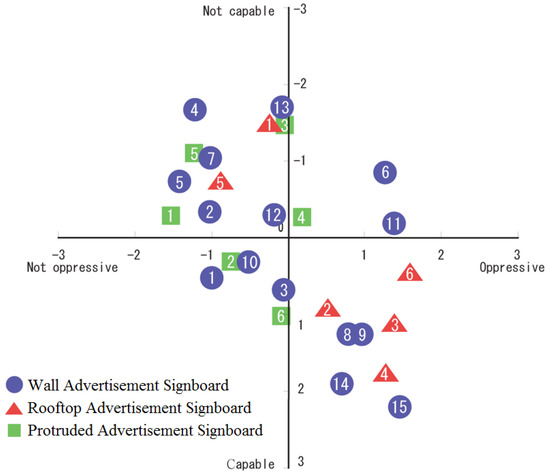 Figure 12 (wall advertising signs), 13 (rooftop advertising signs), and 14 (projection advertising signs). In these cases, it is possible to find the individual positions of each landscape sample, having two axes (No. 1 factor—evaluation and No. 2 factor—capacity). Additionally, the relationship between the No. 1 or No. 2 factors and their proportion can be determined by dividing the proportions in the landscapes into three groups based on their area ratios, from the lowest to highest percentage (i.e., Low, Medium, and High).