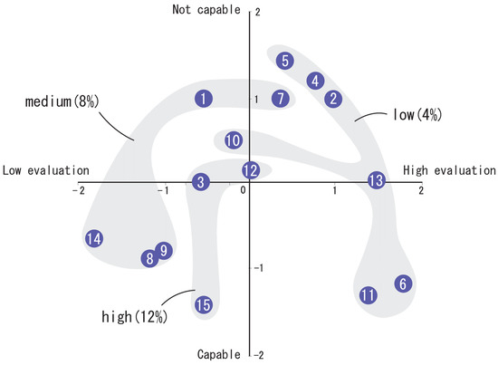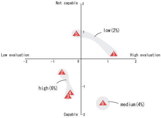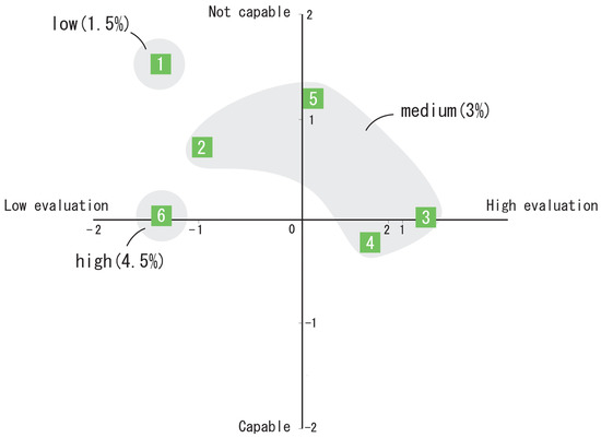 Figure 13), the Low Proportion Group included both “High Evaluation” and “Low Evaluation” with “Low Capacity.” Meanwhile, the Medium Proportion Group included both high evaluations and proportions, whereas the High Proportion Group included “Low Evaluation” and “High Capacity.” On the other hand, for projection advertising sings (
