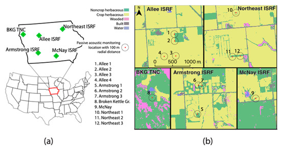 The study area (a) consisted of five sites across Iowa, USA. Passive acoustic monitoring locations (N = 12) are shown with land cover classification (b) in the background developed using PlanetScope (PS) imagery. Research and Demonstration Farms (ISRF) are managed through Iowa State University. Broken Kettle Grasslands (BKG) is a grassland preserve managed by The Nature Conservancy (TNC).