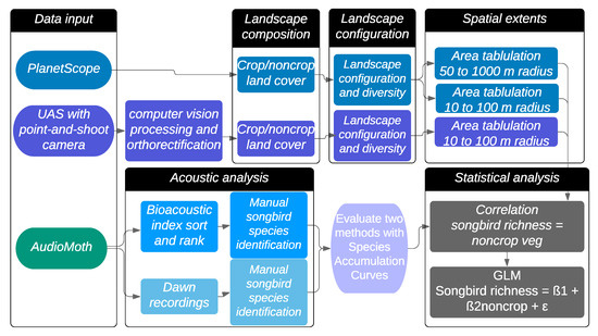 Previous approaches to estimate biodiversity in relation to agricultural landscape structure have relied on labor-intensive and costly fieldwork to acquire data on both species and habitat characteristics [17,18]. The advent of low-cost passive acoustic monitoring and high resolution UAS and satellite imagery offers the potential to lower barriers to measurement by greatly reducing field costs [9]. Passive acoustic monitoring is increasingly being used to characterize wildlife populations, yielding results as good as or better than conventional approaches for estimating species occurrence [19]. Still, it remains unclear whether and how these passive monitoring techniques might be used effectively for this purpose in intensively used agricultural landscapes.