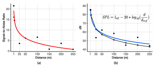 Attenuation of bird vocalization detectability over distance from sensor. Plot (a) is the measured signal-to-noise ratio (SNR). Plot (b) shows the measured sound pressure level (blue line fitted by logarithmic curve) versus theoretical attenuation (equation provided) of a 91 dB sound (black line) by spherical spreading.