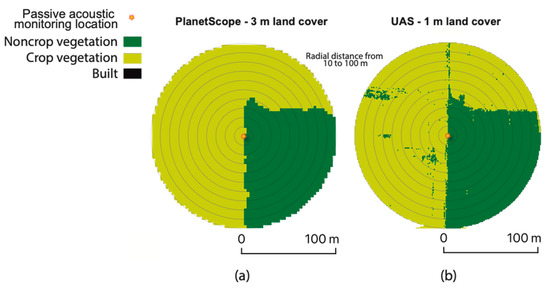 Land cover characteristics from (a) PlanetScope (PS) and (b) UAS imagery were analyzed within 100 m of the passive acoustic monitoring location.